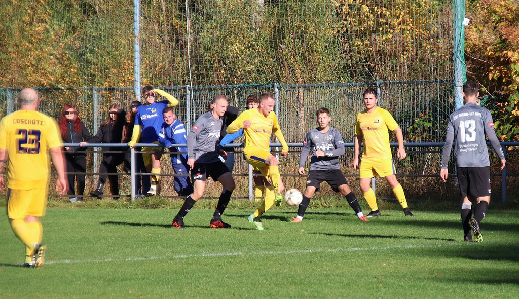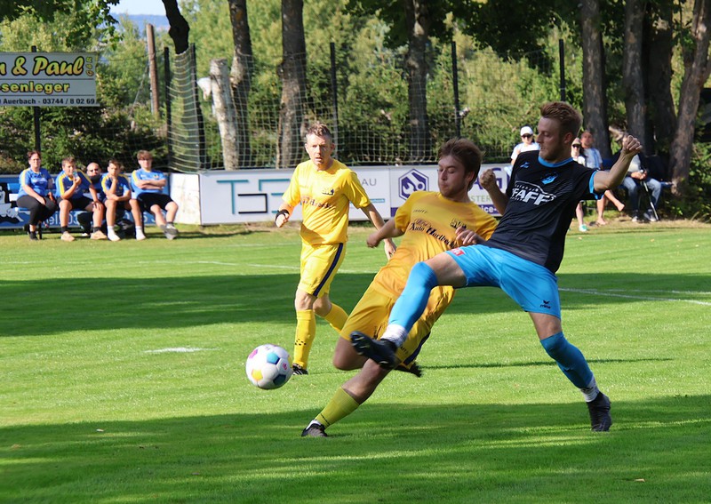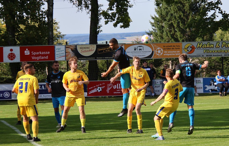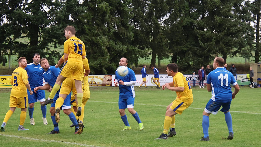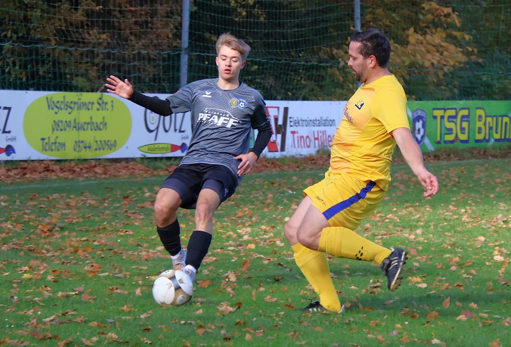 Es war das erwartet schwere Auswärtsspiel am 9.Spieltag. Bei der neuformierten Mannschaft jetzt VfB Auerbach II/ TSG Brunn gab es eine 2 : 3 Niederlage aus unserer Sicht. Trotz einiger Ausfälle von Stammspielern wollten wir die Spitzenposition ausbauen. Die Gastgeber setzten uns von Beginn mit schellen Ballstaffetten unter Druck ohne richtige Gefahr für unsere Abwehr zu kreiren. Wir versuchten diesen entgegenzusetzen. So nach der ersten Viertelstunde kamen wir auch vors gegnerische Tor. Vieles lief über David Flach über die linke Seite. So ein langer Ball in den Strafraum, leider am langen Pfosten vorbei. In der 29.Minute scheiterte Tom Dietzmann am Torhüter. Unsere Angriffsbemühungen wurden mit dem 1.Eckball in der 29.Minute belohnt. Wieder war es David der leider am Tor knapp vorbei schoß. Es dauerte aber auch bis zur 38.Minute für den ersten Eckball der Gastgeber. Das 1 : 0 fiel durch ein Eigentor von Christoph Stier in der 42. Minute. Er fälschte einen Ball ins eigene Netz ab, Maurice hatte keine Chance.