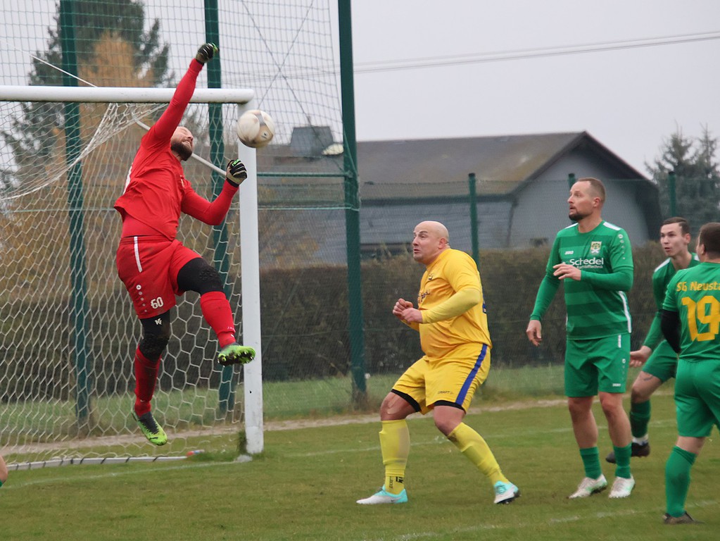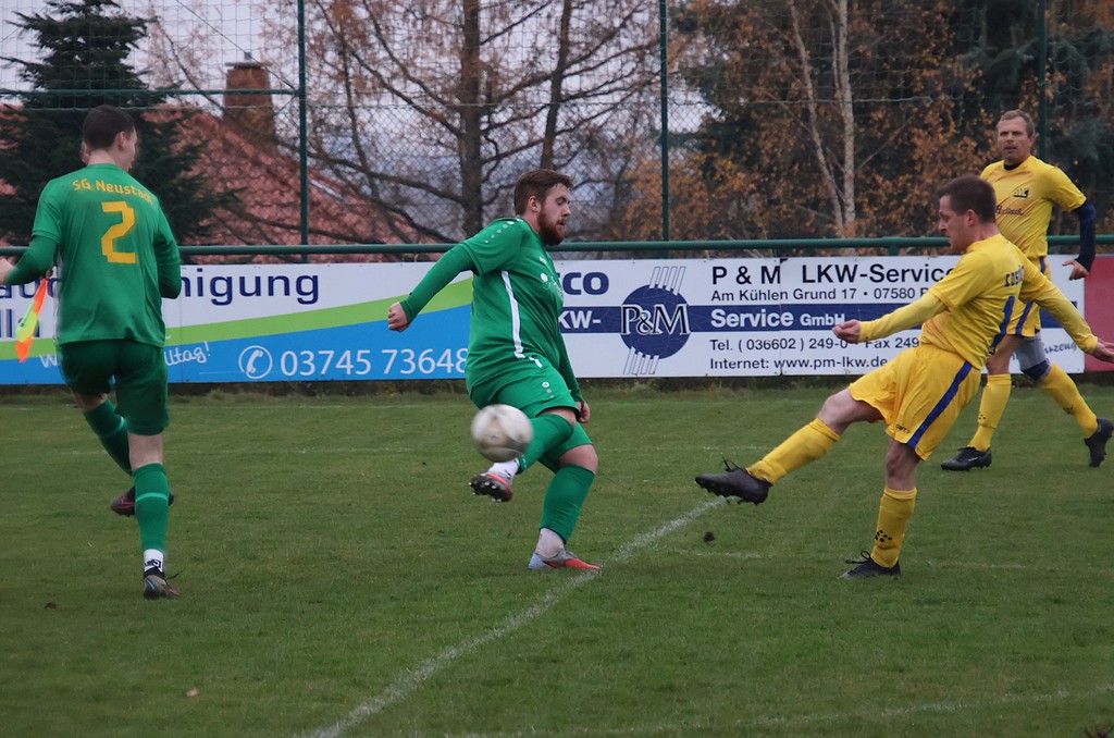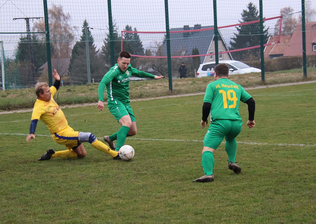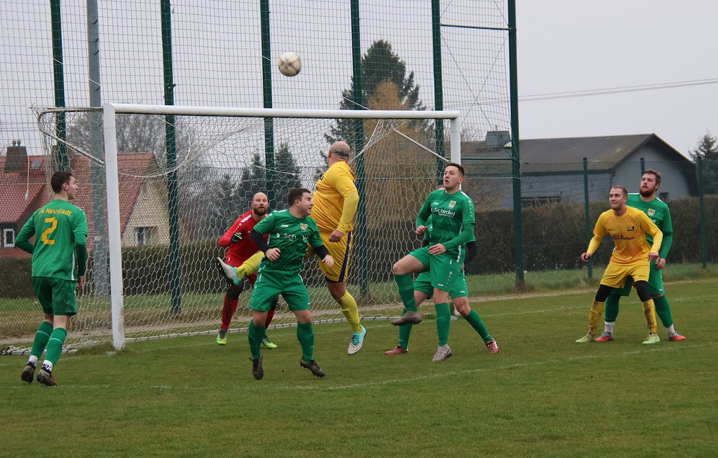 Dabei fingen wir gut an. Aus guter Vorarbeit von André Petzold auf Tom Dietzmann ging der Ball übers Tor in der 11.Minute. Im Gegenzug der Neustädter fiel das 1 : 0 eine Minute später. Keine Minute später wurde André im Strafraum gefoult. Dainel Reinhold scheitert an Torhüter. Neustadt spielte sich nun besser in die Partie , in der 17.Minute fast das 2 : 0, doch der Kopfball ging noch vorbei.Den Ausgleich verpasst André 2 Minuten später. Besser machten es die Gastgeber, ein langer Ball ging über unseren Keeper ins lange Eck, 23.Minute. Nach einer schlechten Abwehrleistung stand es 3 : 0, keine 3 Minuten später. Als Daniel Reinhold im Strafraum gefoult wurde, bekamen wir den 2. Elfmeter. Michael Strauß verkürzte auf 3 : 1 in der 40.Minute.